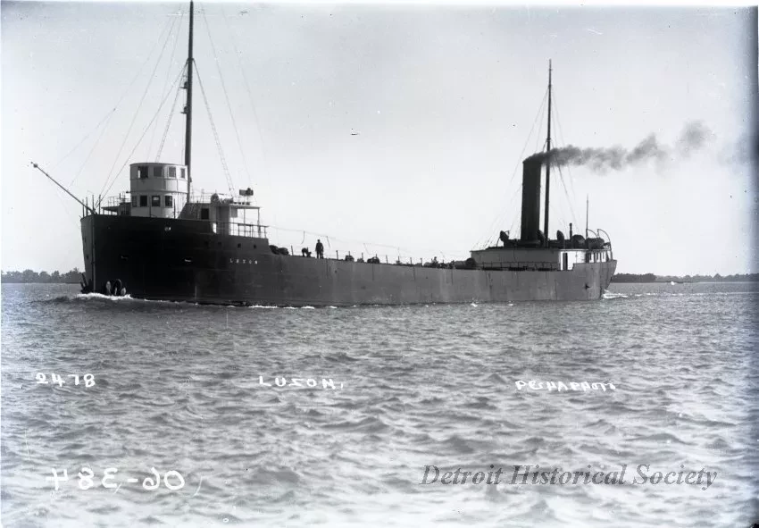 Monochromatic glass-plate negative from the studio of Louis James Pesha depicting the bow and port side of the freighter LUZON, under steam. Three figures--one bending down, one standing, and the last seated--are on the main deck. A tree-lined shoreline is visible in the background.