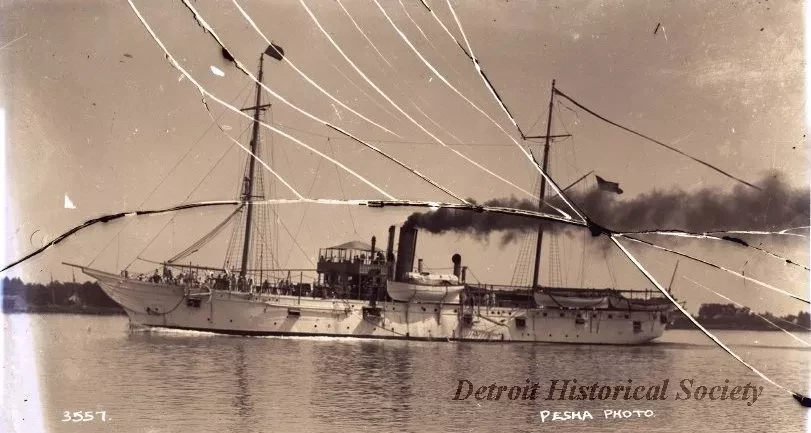 Negative, glass-plate. Monochromatic glass-plate negative from the studio of Louis James Pesha depicting the port side of a two-masted, propellor-driven steamer, under steam with sailors lining its decks. The negative was originally packaged inside an envelope marked, "AMARANTH," but the curved bow and central pilot house don't match the Coast Guard vessel of that name. It more closely resembles the ESSEX