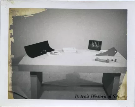 Polaroid image of a table with various items relating to the topic of the film "Lock Cylinder Service and Repair." Items on the table include a large key, an enlarged view of the inside of a lock, and more.