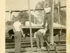 Sepia-toned photo of Lee Schoenith standing on the port side of the hydroplane GALE II, beside its cockpit. The hydroplane is supported atop a stand within a hoist. Schoenith gathers a rope, as a man standing on the ground below bends down to inspect the stand. Another man looks on from the foreground. A note that accompanied the photo when it was previously housed inside an album read, "Lee Schoenith on Gale II 1951."