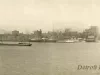 Black and white photograph showing a panoramic view of Detroit's River Front in 1905. The photograph was used as a reference photo for an illustration for a print issued by the Detroit News. The panoramic view features the Detroit River in the foreground with several ships traversing the river. Notable buildings visible include the Fort Street Presbyterian Church, Majestic Building, and the Wayne County Building. The photograph is mounted on grey paper which is mounted on linen.