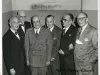 Black and white photographic print of a photograph taken at the Detroit News Old Timers Reunion in 1951. The photo shows ten men standing in the stairway entrance to the Pilot House. A sign reading "You Must be 21 to Enter" can be seen above their heads. The men are identified on the reverse side of the photograph, from left to right, as follows: Albert Loren Weeks, Henry A. Montgomery, Jay G. Hayden, George W. Stark, John Manning, Lee J. Smits.