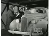 Black and white photographic print showing a 1939 Packard Motor Car Co. automobile, with Michigan license plate "Y 43943," being tested in a cold room. One man is sitting in the driver's seat and two other men are making observations through the open right side hood panel.