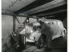Black and white photographic print of a front and left side view of a 1939 Packard Motor Car Co. automobile, with Michigan license plate "Y 43943," undergoing tests in a cold room. There are three men observing various testing devices, including a man at bottom left holding a clipboard observing a device on the ground, a man at center right operating a device under the hood, and a man in the back operating a "Sun Motor Tester."