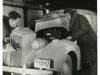 Black and white photographic print of a front and left side view of a 1939 Packard Motor Car Co. automobile, with Michigan license plate "Y 43943," undergoing tests in a cold room. Two men are making observations on tests underneath the left side hood panel. A Sun Mfg. Company Battery and Starter Tester is hooked up to the Packard.