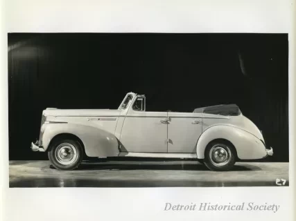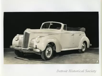 Black and white photographic print of a front and left side view of a white Packard 120 convertible with the convertible top up. The photograph is marked with the number "7" on the bottom right corner.