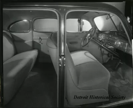 Black and white photographic print showing the interior of a 1940 Packard 110/120, including the front and rear seats and instrument panel, taken through the open front and rear right side doors.