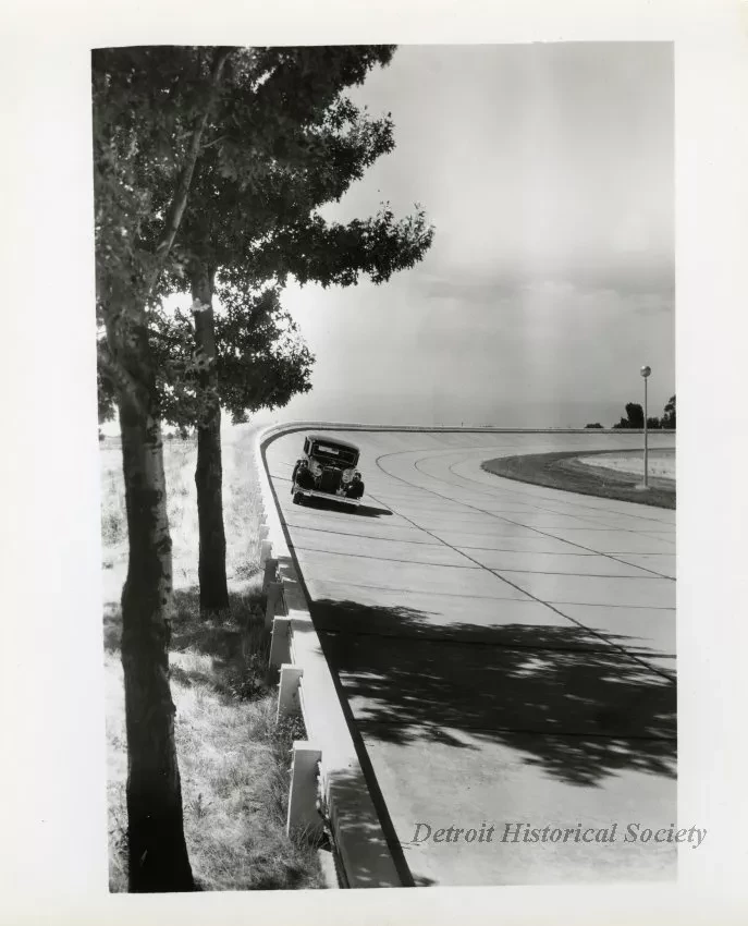Request ImageBlack and white photograph of a front end view of a Packard Motor Car Co. automobile driving on the test track at the Packard Proving Grounds.
