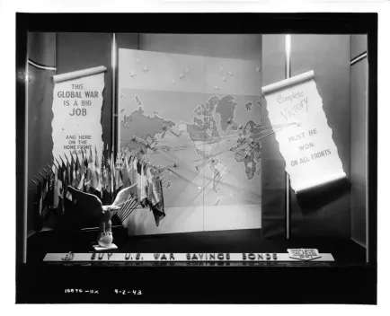Print. Black and white photographic print of a window display at J.L. Hudson Company Department Store. A large Mercator projection map is featured with adjacent signage reading, "Complete Victory Must be Won on All Fronts." Strings from a star on the sign lead to continents and countries throughout the map including China, South Pacific, Iceland, Europe, Panama Zone, Middle East, and North Africa. Signage left of the map reads, "This Global War is a Big Job and here on the home front also." Flags from countries around the globe, including the United States are displayed behind an eagle. Also, signage in the central foreground reads, "Buy U.S. War Savings Bonds, Immediate Delivery WAR BONDS, 11th Floor, Woodward, Section D." The photographic sequence number and date are printed on the bottom of the recto, "18870-11x; 9-2-43."