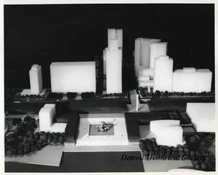 Black and white photographic print depicting a detail of an incomplete architectural model of a proposed design for Civic Center Plaza. It shows a view across the plaza, facing north from the Detroit River.