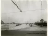 Black and white photo of the Detroit plaza of the Ambassador Bridge as taken from Porter Street facing south. A flag pole stands at the northwest corner of the plaza. Tollbooths and inspection booths run along the center of the plaza. An inspection area with a ramp is on the left. The U.S. Customs Offices stands on the southeast corner of the plaza. The Ambassador Bridge stands in the background. Part of Webster Public School is visible along the left edge of frame. Streetcar cables are overhead in the foreground.