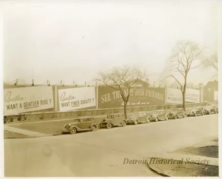 Black and white photographic print depicting a block-long Walker & Co. billboard advertising Packards. It is located on the north side of E Grand Boulevard between Canton and Concord Street. Several Packard automobiles are parked in front of it. Dated April 4, 1939.