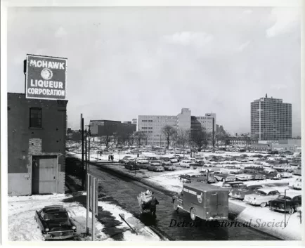 Black and white photograph depicting a view along Hastings Street, looking north from E Lafayette Street. To the left is the Mohawk Liqueur Corporation. To the right is a large parking lot full of cars. In the background are the Stroh Brewery, Wayne State University School of Medicine, and The Pavilion. Dated Jan 5, 1959.