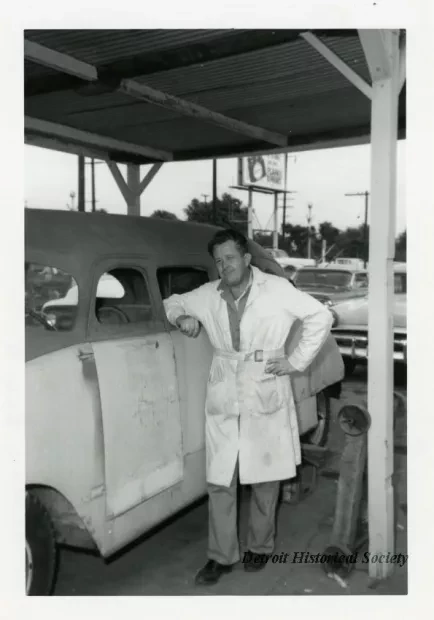 Black and white photograph showing Lorne Northway standing inside a garage next to the rear left door of a Stout Scarab and wearing a dirtied work robe. His right elbow is resting on the door of the Scarab. Additional automobiles are visible in the background, as is a billboard reading, in part, "Plan Ahead."