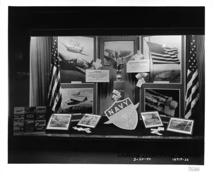 Print. Black and white photographic print of a window display at the J.L. Hudson Company Department Store. Images of Naval aviation missions and procedures are flanked by two American flags. A metal sculpture of an eagle perched on a sphere with a shield shaped emblem affixed at the base. Signage left of the eagle reads, "Opportunity! Your WINGS of GOLD will be your passport to the seven skies. As you roar into the wild blue yonder, you're secure in the knowledge that you've been trained by the finest, and wherever you go there'll be THRILLS - ACTION - GLORY, Apply Now, Naval Aviation Center Selection Board, 9th Floor Book Bldg." Also, signage right of the eagle reads, "High School Seniors and Graduates, Makes your decision now! And win your WINGS OF GOLD! Qualifications: 1. U.S. Citizen... 2. Age 17 to 26 Inclusive... 3. High School Graduate by June 30th... 4. Unmarried... 5. Good Health; Apply - Naval Aviation Cadet Selection Board, 9th Floor, Book Bldg." The date, photographic sequence number and photographer's name are printed on the bottom of the recto, "3-20-44; 18919-2x; Davis B. Hillmer."