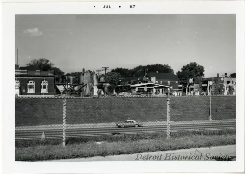Black and white photo taken from the northeast side of the John C. Lodge Expressway of a burned-down building beside the Lodge-Euclid Shell Service Station along the John C. Lodge Service Drive, between West Euclid Street, and Virginia Park Street. "Jul 67" is printed in the photo's border.