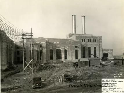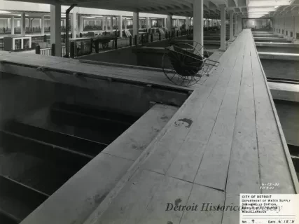 One black and white photograph showing two water pumps inside the Springwells Water Treatment Plant in Detroit. The view looks across a pump pit and shows two short stairways and adjacent handrails along with two Worthington pumps and their accompanying electric motors. Water main, mechanical joint pipe sections, control valves, and gauges are also visible. Tile walls and flooring can be seen in the background.