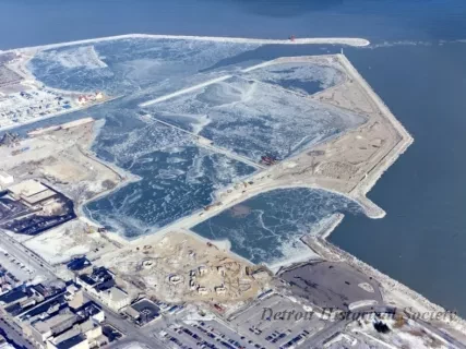 One color photograph showing an aerial view of the new harbor construction at Racine, Wisconsin. The view looks southeastward across the inner harbor and shows rip rap breakwaters and buildings along the Lake Michigan shoreline. The Racine Coast Guard station is visible at the mouth of the Root River as well as three barges and a tugboat. The harbor construction work was done by the Dunbar & Sullivan Dredging Company.