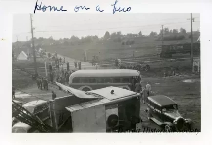 One sepia-toned photograph showing passengers and striking workers of the SS Noronic in Thorold, Ontario. The elevated view shows groups of passengers and strikers on shore. A crane, a bus, and a car can be seen in the foreground. Several stranded passengers are boarding the bus. Railroad tracks and a grassy field are visible in the background. Handwritten text on the top edge of the photo shows "Home on a bus." Handwritten text on the verso shows "May, 1946." The SS Noronic was a passenger steamship of the Northern Navigation Division of Canada Steamship Lines.