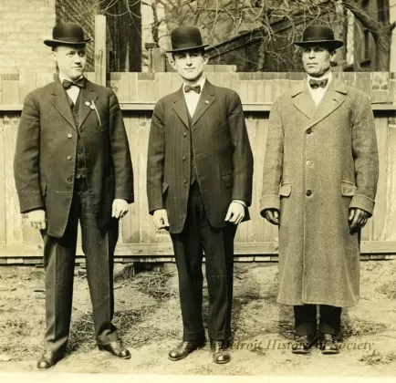 One sepia-toned photograph of three young men. All are well-dressed and are standing on a grass area which appears to be in a residential backyard. A wood fence and buildings are visible in the background. The man at the right is roller skating entertainer, Jack Fotch. The other two men are not identified.