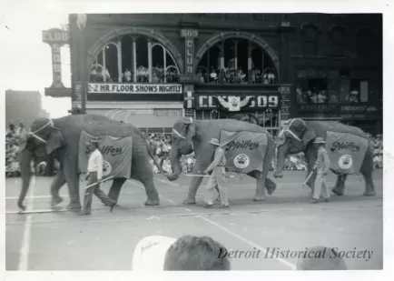 One black and white photograph of the Detroit 250th Birthday Anniversary parade. The photo looks across Woodward Avenue near Larned Street and shows a trio of elephants and their handlers walking along the street. The elephants are wearing banners that advertise "Pfeiffer's" beer. Many spectators can be seen on the sidewalks and in building windows in the background. Club 509 and Gregory's Barber Shop are also visible in the background.