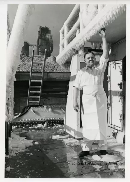 One sepia-toned photograph of a crewman who is standing beneath icicles that have formed on the cabin structure aboard the bulk carrier, SS Charles M. Schwab, of the Interlake Steamship Company. Black typewritten text on the verso reads "John Detrich, Steamer Schwab, November 13, 1940, Indiana Harbor."