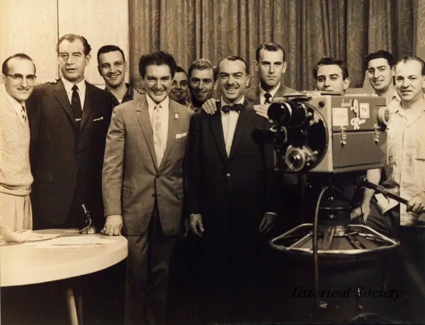 One black and white photograph of Bill Kennedy (second from left) with pianist, Liberace (fourth from left), and the staff of CKLW-TV. All are standing on the studio set. An interview table can be seen at the left side of the photo and a television camera can be seen at the right. A wall and drapery are visible in the background.