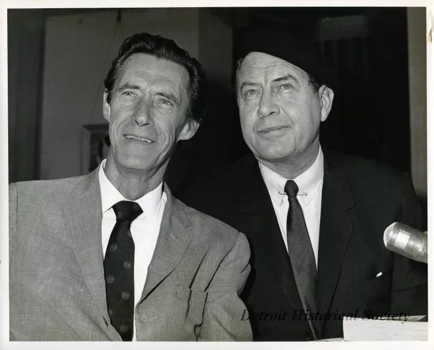 One black and white glossy photograph of actor, John Carradine (left), and Bill Kennedy (right). Both are well-dressed in suits and are seated behind an interview desk with a microphone. A wall and doorway are faintly visible in the background. Handwritten blue pen text on the verso reads "John Carradine, Monday - July 19, 1965," and "very good interview."