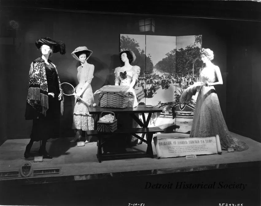Print. Black and white photographic print of the Cavalcade of Fashion window display at The J.L. Hudson Company Department Store commemorating the 250th anniversary of the city of Detroit and Hudson's 70th year of business. Four female mannequins are dressed in period clothing circa 1905 and 1910 and standing around a picnic table in front of an aerial view of Belle Isle. Signage in the right foreground reads, 'Cavalcade of Fashion Through 250 Years, Picnics on Belle Isle were favored by young and old alike in the early 1900s. The beautiful natural park was important in the social and sports life of Detroit. Now fashions were more slender... designed for more freedom of movement. Hats were large and face-framing with gay floral and feather trims." The date and photographic sequence number are printed on the bottom of the recto, "7-10-51; 25243-11x."