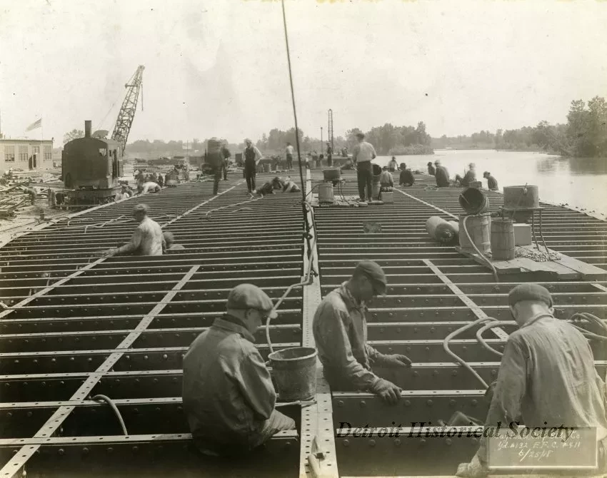 One sepia-toned photograph of the cargo ship, LAKE WINOOSKI (Hull #132), under construction at the Saginaw Ship Building Company yard in Bay City, Michigan. The photo shows a view along the main deck of the vessel and workmen who are installing structural hardware prior to the placement of deck plates. A crane and yard building can be seen in the left background and the Saginaw River is visible in the right background. Handwritten text in the lower right corner reads "Saginaw Ship Bldg. Co., Yd. #132, E.F.C. [Emergency Fleet Corporation] #411, 6/25/18."