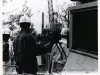 One black and white photograph of the work operations for laying an underwater telephone cable across the Trenton Channel of the lower Detroit River. The photo shows a Dunbar & Sullivan Company barge with a crane and cable reel in the background. Several workmen are standing near the reel on the barge deck. Three Michigan Bell Telephone Company workmen (wearing hardhats) are standing beside a construction machine near the shoreline in the foreground.