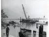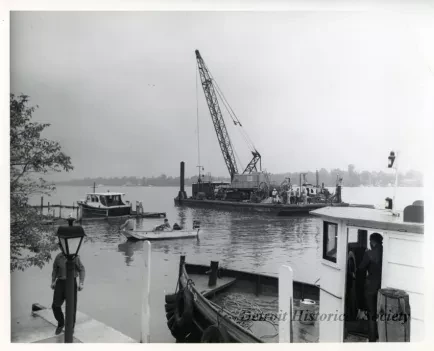 One black and white photograph (and one copy) of the work operations for laying an underwater telephone cable across the Trenton Channel of the lower Detroit River. The photo shows a Dunbar & Sullivan Dredging Company barge with a cable reel and crane. Cable is unwinding from the reel and is passing over a guide bar before entering the river. Groups of workmen are standing or seated on the barge deck, and the tugboat, Paddy Miles, is moored alongside. In the foreground, a small marina with fuel pumps is visible along with a light pole, a dock, and the small tugboat, Norma B. The Grosse Ile shoreline is visible in the background.