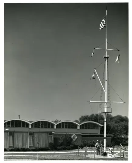 One black and white photograph of a flagpole in front of the Knights of Columbus hall located at 25160 W. Outer Drive in Lincoln Park, Michigan. The flagpole is styled after a ship mast and has a wheel, anchor, and windlass near the base. A man is standing in a posed position behind the ship's wheel. The "K of C" sign is visible on the building in the background.