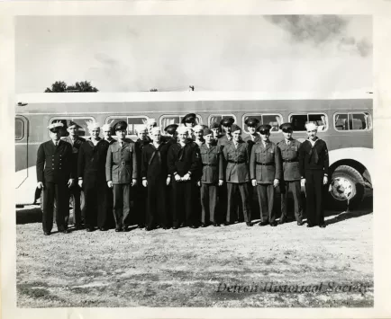 Black & white photograph depicting a military glee club standing in front of a bus. At an award ceremony for the Monroe Auto Equipment Company receiving the Army-Navy "E" during World War II. Dated September 21, 1942.