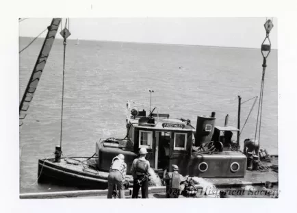 One black and white photograph of the tugboat, PADDY MILES, of the Dunbar & Sullivan Dredging Company. The photo shows a port side view of the sunken tugboat which is being raised by two derrick boats. Workmen in the foreground are overseeing pumping operations. Calm lake waters and a distant shoreline are visible in the background.
