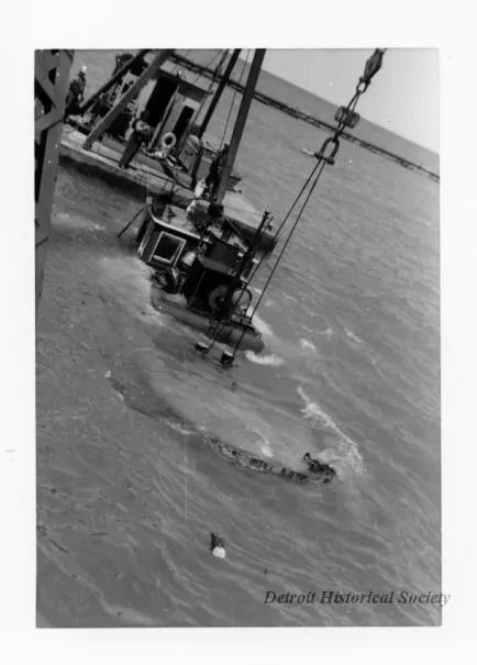 One black and white photograph of the sunken tugboat, PADDY MILES, of the Dunbar & Sullivan Dredging Company, which is being raised by two derrick boats. Lifting cables and the top of the tugboat are visible in the foreground. A derrick boat is visible in the background. Calm lake waters and a floating pipeline can be seen in the far background.