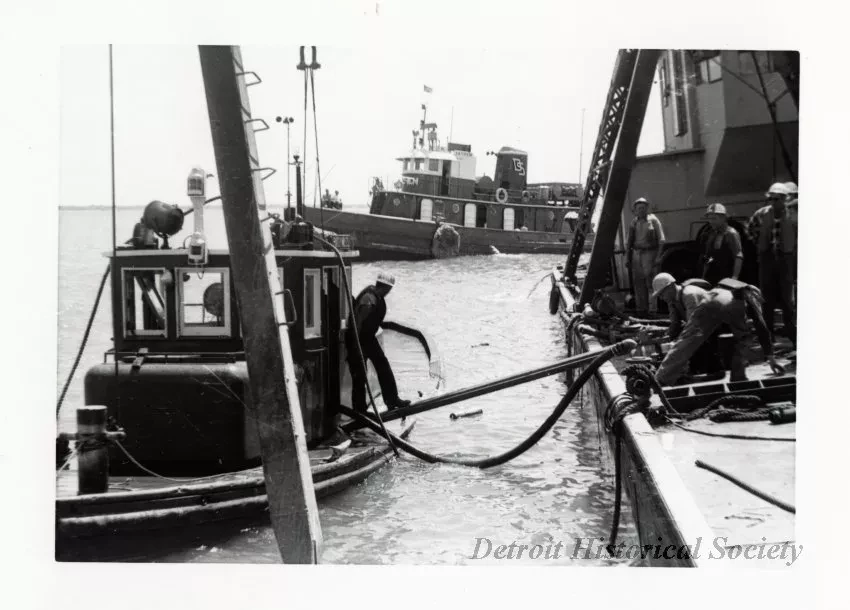 One black and white photograph of the sunken tugboat, PADDY MILES, of the Dunbar & Sullivan Dredging Company, which is being raised by two derrick boats. The tugboat cabin structures and deck are visible in the foreground along with lifting cables. The side deck of one of the derrick boats can be seen at the far right side of the photo. The tugboat, Sachem, can be seen in the center background. Calm lake waters and a shoreline are visible in the far background.
