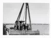 One black and white photograph of the recovery operations of the sunken tugboat, PADDY MILES, of the Dunbar & Sullivan Dredging Company. The tugboat is to be raised by two derrick boats. The side deck of one of the derrick boats can be seen at the far left side of the photo. The second derrick boat can be seen in the background. A floating pipeline and calm lake waters can be seen in the far background.