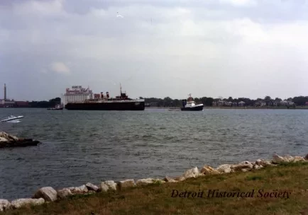 One color photograph of a railroad car ferry (possibly the SS MADISON) of the Grand Trunk Milwaukee Car Ferry Company. The vessel is being towed by two tugboats down the Detroit River near Belle Isle and appears to be headed to a scrapyard. The Detroit shoreline is visible in the foreground and the Windsor shoreline can be seen in the background.