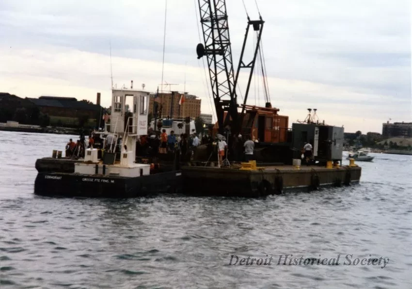 One color photograph of a crane barge and the tugboat, CORMORANT, from the Faust Corporation. The vessels are part of the crew which participated in the raising of a large ship anchor from the SS EDMUND FITZGERALD from the Detroit River in the area located upstream of the Renaissance Center. The photo shows a view of the two vessels in the foreground. Many workmen and observers are standing on the tugboat and barge decks. The old Parke Davis building and several apartment buildings can be seen along the Detroit shoreline in the background.
