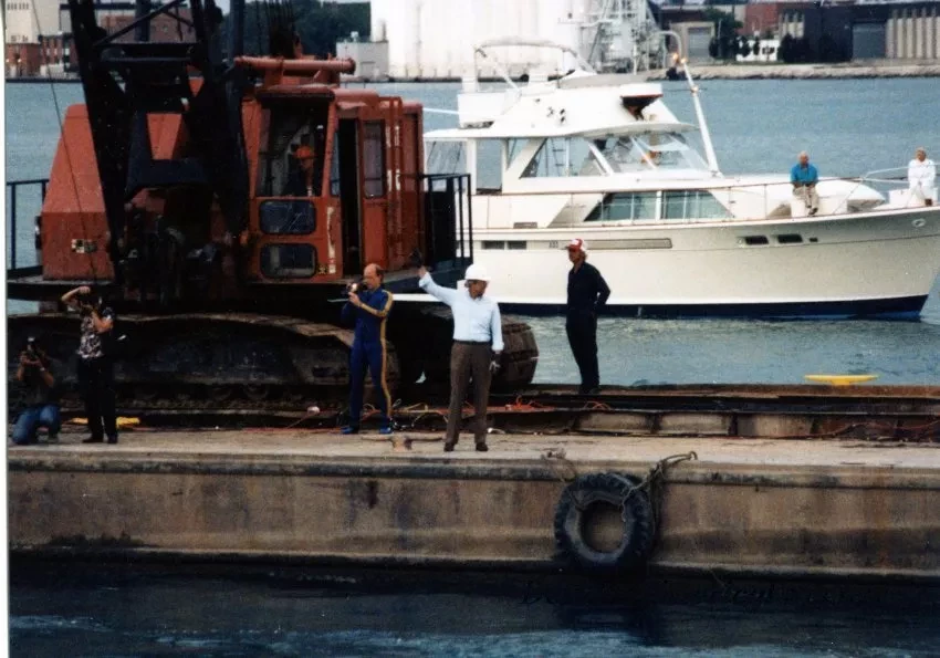 One color photograph of a crane barge from the Faust Corporation. The barge is part of the crew which participated in the raising of a large ship anchor from the SS Edmund Fitzgerald from the Detroit River in the area located upstream of the Renaissance Center. The photo shows a side view of the barge in the foreground. Several men are standing on the barge deck. The company owner, Marcus Faust (wearing white hardhat), is standing near the crane and is giving directions with his raised right arm. The Windsor, Ontario, shoreline and a powerboat are visible in the background.