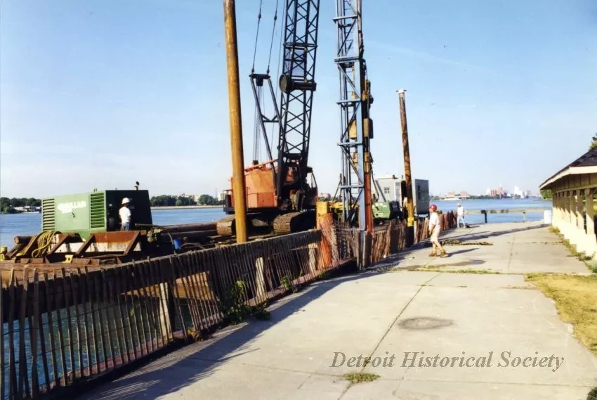 One color photograph of a crane barge from the Faust Corporation. The barge is moored along the Belle Isle shoreline adjacent to picnic shelter #9 (just upstream of the Dossin Great Lakes Museum) and is using a pile driver to install a new seawall. A sidewalk is visible in the foreground with the Detroit River and Windsor shoreline visible in the left background. The picnic shelter can be seen in the right background.