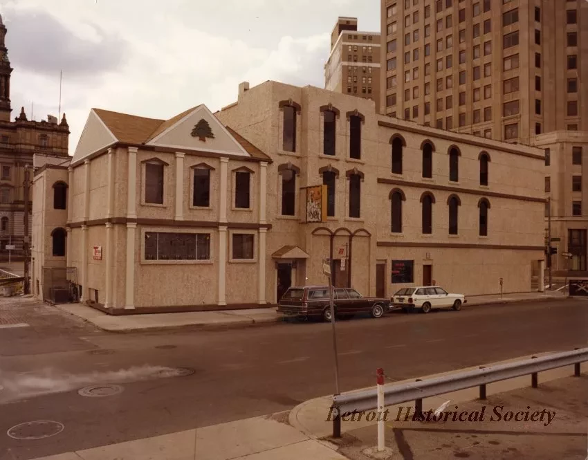 One color photograph of "The Sheik" restaurant located at 316 East Lafayette Street in downtown Detroit. The photo shows the street in the foreground, two parked cars, and the adjacent 2-story and 3-story restaurant building with its overhead sign at the entrance. A portion of the old Wayne County building can be seen in the background at the far left. The Detroit Water Board building on Randolph Street can be seen in the right background.