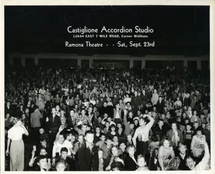 One sepia-toned photograph of a large group of children who are seated or standing in the Ramona Theatre in northeast Detroit. The view looks out across the crowd from the stage. Most are casually dressed and are watching and/or cheering as they view various accordion performances that were sponsored by the Castigione Accordion Company. White printed text at the top of the photo reads "Castiglione Accordion Studio, 12644 East 7 Mile Road, Corner Waltham," and "Ramona Theatre - Sat., Sept. 23rd." A red ink stamp on the verso has text that reads "Robert J. Anderson, Photography, VErmont 5-5505, 9243 Penrod Ave., Detroit 28, Mich."
