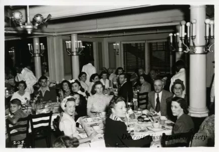 One black and white photograph of passengers at dinner in the main dining room aboard the steamship, SS SEEANDBEE, of the Cleveland and Buffalo Transit Company. The view looks across the crowded dining room and shows well-dressed diners who are seated at tables that are covered with white tablecloths and china. Structural columns and light fixtures can be seen in the background Windows can be seen along the wall in the far background. Clarice Hoskins is wearing a dress with a wide white collar and can be seen in the background near the center of the photo. Her classmate, Posie Keim, is seated to her left. Handwritten black ink text on the verso reads "Wednesday, August 13, 1941, evening," and "Main dining romm."