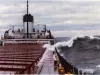 Request ImageColor photograph taken peering along the port side of the deck of the U.S. Steel Corporation freighter PHILIP R. CLARK, as waves crash over the side.