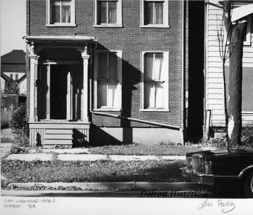 Black and white photographic print mounted on board depicting houses on the north side of Labrosse Street, with a car parked in front. Dated October, 1984.