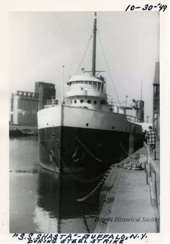 Black and white photo with the handwritten caption, "'S.S. SHASTA' - Buffalo, N.Y. During Steel Strike, 10-30-'49," depicting the Shasta Steamship Company freighter SHASTA, at dock, as taken off of its bow from the shore, during the 1949 United Steel Workers of America strike. A man stands on the shore on the right. A row of silos stand in the background on the left.