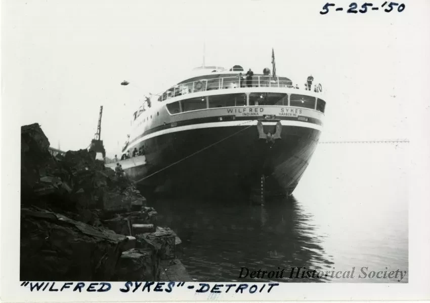 Black and white photo with the handwritten caption, "'WILFRED SYKES' - Detroit, 5-25-'50," depicting the Inland Steel Company freighter WILFRED SYKES, at dock in Detroit, as taken from the shore off of its bow, a pile of debris is on the shore in the foreground. Beyond it, people line board the freighter via a ramp. Several people stand onboard the freighter at its stern.