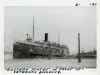 Black and white photo with the handwritten caption, "'EASTERN STATES' in front of Veterans Building, 6- -51," Detroit and Cleveland Navigation Company passenger steamer GREATER DETROIT, docked along Detroit's riverfront, as taken from the shore off of its port bow. Two light posts stand in a lot in the foreground. Beyond it, several cars are parked on the shore near the ship. The stack of another steamer and the Ambassador Bridge are in the background.
